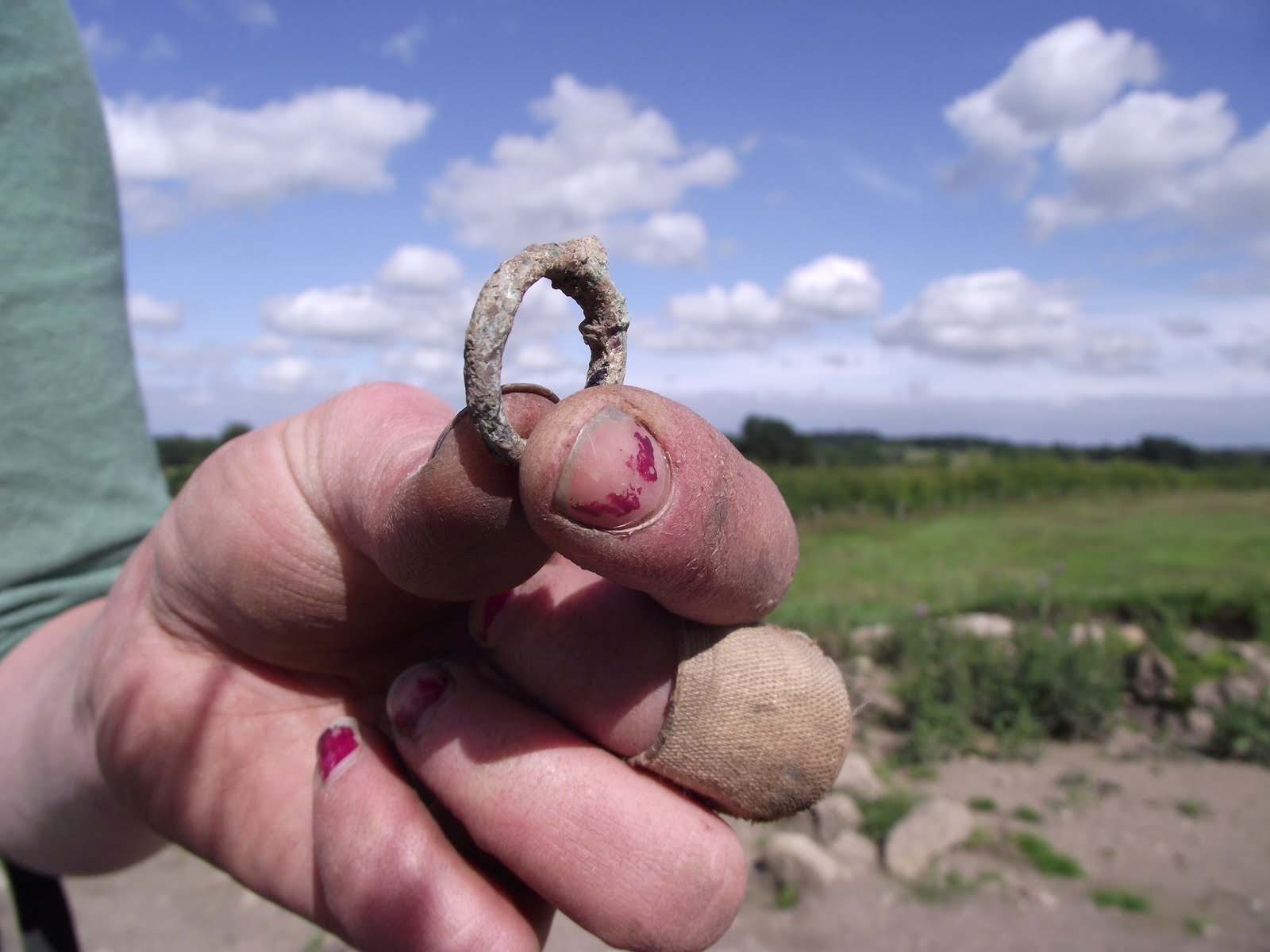 On site there was great progress in both trenches. In Trench 1, almost the entire interior of the medieval building has been removed, although there is no trace of a convincing floor surface. Some rubble remains on the eastern end and there are hints that the actual eastern gable wall of the structure survives beneath this, and that the row of stone on the embankment we'd always assumed as the end wall is nothing to do with it. Along the ramparts, the roadside gullies are becoming increasingly clear and we've made great progress on two substantial pits cut into the rampart. Otherwise, its been business as usual on the other pits, although Hilly found a nice ring from the big pit.
