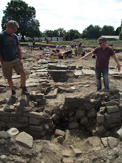 I meant to mention earlier that in the first half of this year's season we'd found a fragment of carved stone seemingly shaped like a semi-circular boss. Jamie has flagged up it looked like a bit of early medieval sculpture, but I must admit I thought there would probably be a Roman parallel out there. However, having now shown it to both Roman sculpture people and early medieval people it is looking pretty likely to be a fragment of an early medieval sculpture- possibly a central boss from a late Anglo-Saxon cross. This is exciting and raises lots of question (not least of which is, where is the rest of the cross?). It comes from an area of site well away from the known 8th century Anglo-Saxon cemetery, which was in the vicinity of the current Binchester Hall. Instead it came from a pile of stone rubble on the edge of Dere Street in the vicus. Was it a roadside cross? If so, it wouldn't be the only one known from Dere Street with the Legs Cross standing close to the Roman road at Bolam (between Binchester and Piercebridge) where it probably marked the boundary of the large Anglo-Saxon estate granted to the known monastery at Gainford.